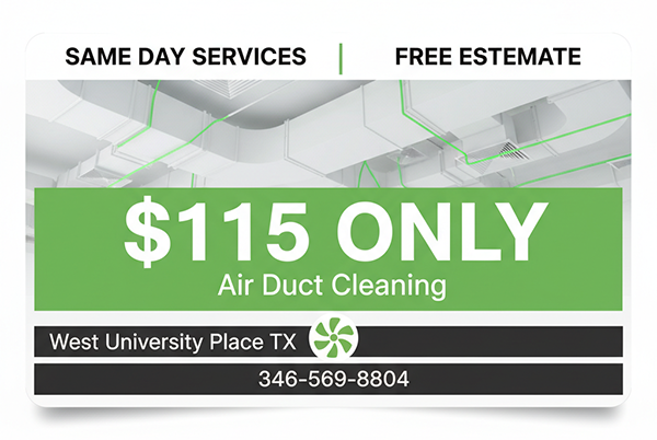 Air Duct Vent Cleaning West University Place TX delivers dependable duct and dryer vent care designed to improve airflow, boost HVAC performance, and reduce allergens. Our skilled technicians use advanced HEPA tools, eco-friendly sanitizers, and detailed inspections to keep homes and businesses fresher, cleaner, and more comfortable every day.